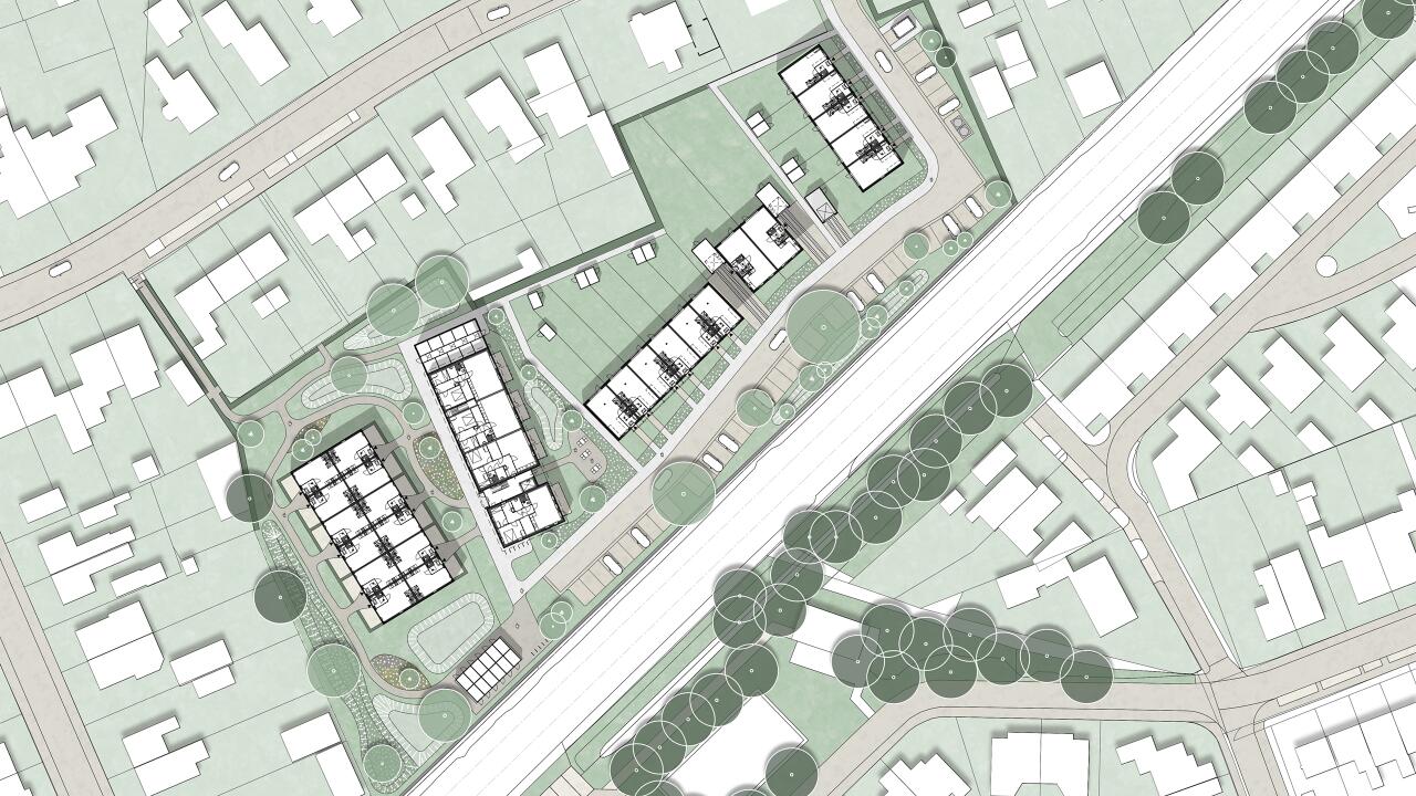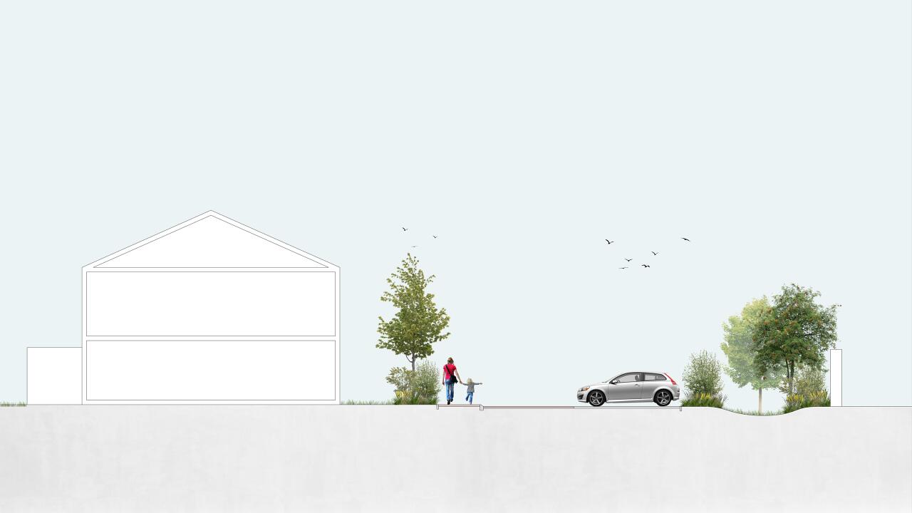 De woonstraat vormt de entree van het plan en heeft een groene, dorpse uitstraling. De woningen liggen iets terug van de rijweg en worden gescheiden van de openbare ruimte door een gemengde houtwal/haag. Deze bestaat uit circa 70% heesters en 30% vaste planten en bevat bloeiende, eetbare en deels wintergroene soorten. Langs de straat worden bomen geplant die zorgen voor schaal, schaduw en een herkenbaar straatbeeld. Parkeerplaatsen zijn uitgevoerd in groenverharding, waardoor regenwater kan infiltreren en de straat een groen karakter behoudt.